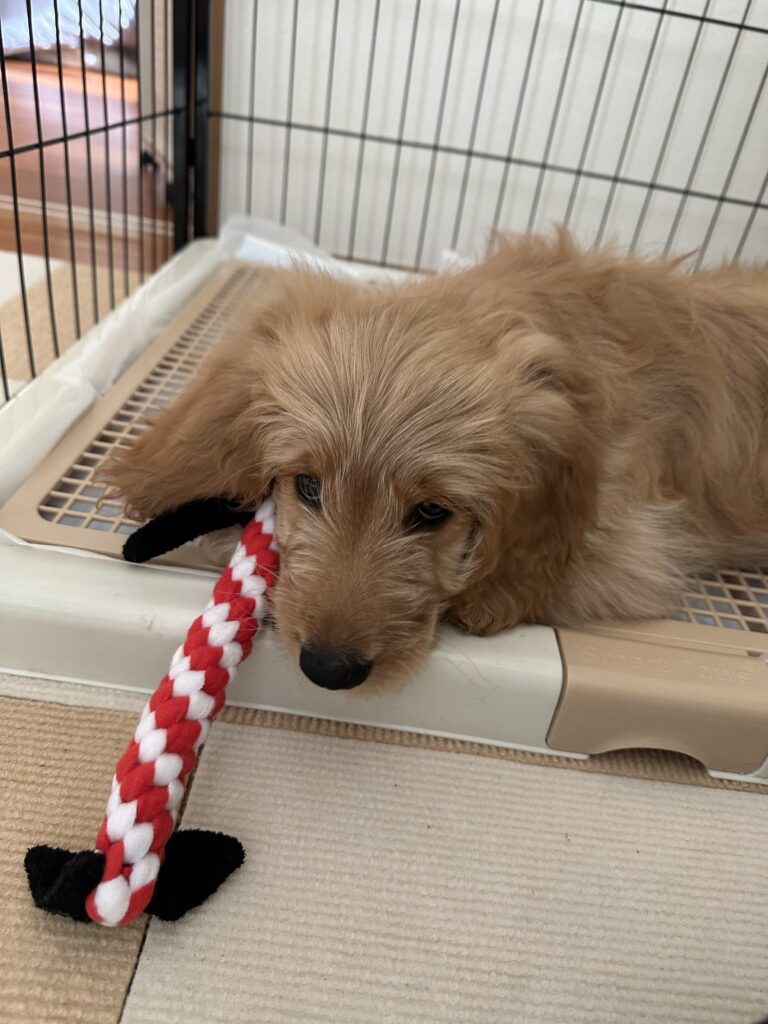 最初のころはお散歩から帰るとすぐに寝ていたのですが、まだまだ遊びたい!とおもちゃを持ってきて誘いに来るのです(笑)